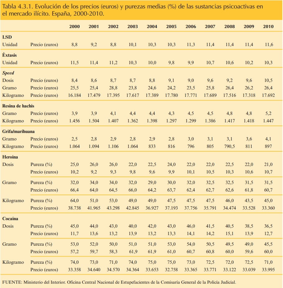 En el cuadro de evolución de los precios de las drogas observamos inmediatamente la ausencia de la heroína y la cocaína. En este caso ambas sustancias han evolucionado realmente el precio de manera diferente al resto de sustancias durante de los 10 años que contempla el informe. La cocaína ha descendido de precio pasando de ser una droga de consumo teóricamente elitista en la década de los 80 del pasado siglo a una de consumo masivo en los primeros compases del presente siglo, la evolución del precio a la baja también ha corrido paralela al aumento de su introducción en los mercados europeos y fundamentalmente el español.